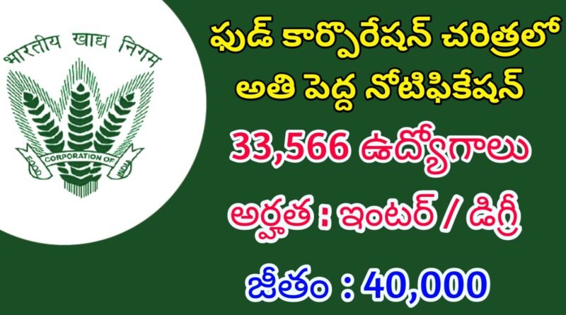 Read Moreఫుడ్ కార్పొరేషన్ ఆఫ్ ఇండియా ( FCI ) నుండి భారీ నోటిఫికేషన్ విడుదల చేశారు. ఈ నోటిఫికేషన్ ద్వారా వివిధ రకాల విభాగంలో మొత్తం 33,566